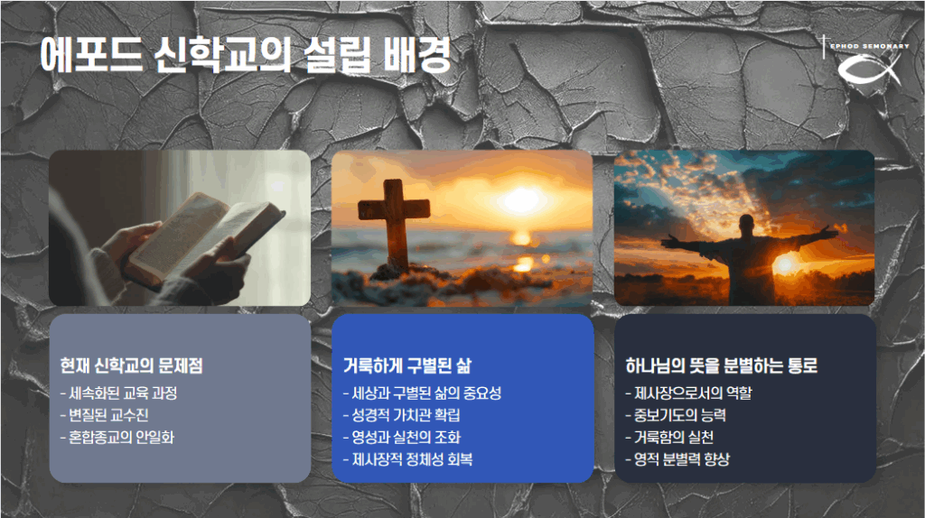 애포드 신학교는 “말씀으로 세워진 교회, 교회로 변화되는 세상”이라는 소명을 품고 설립되었습니다. 우리는 성경적 학문과 영적 형성을 균형 있게 추구하며, 미래 세대를 섬길 목회자와 선교 리더를 양성합니다. 캠퍼스에서, 온라인 강의실에서 함께 기도하며 배우길 기대합니다.